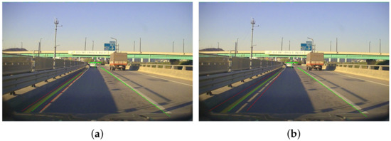 - Choi, H.-C.; Park, J.-M.; Choi, W.-S.; Oh, S.-Y. Vision-based fusion of robust lane tracking and forward vehicle detection in a real driving environment. Int. J. Automot. Technol. 2012, 13, 653–669. [Google Scholar] [CrossRef]