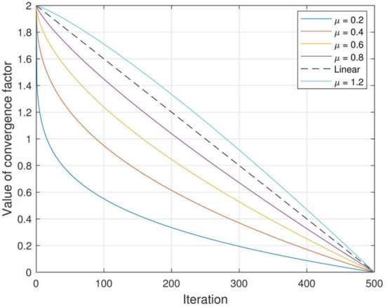 In the basic WOA, the convergence factor tunes the global and local search phase by controlling the value of . According to Equation (2), the larger the value of is, the stronger the global search capability is. On the contrary, the smaller the value of is, the stronger the local search ability is. When dealing with optimization problems, the ideal optimization process is to have a strong global search ability with a fast convergence speed, and meanwhile, maintain fast convergence with high accuracy. Obviously, the linear decrement strategy of does not meet this expectation. Based on the characteristic of power function, a nonlinear convergence factor is proposed, and its update formula is as follows: