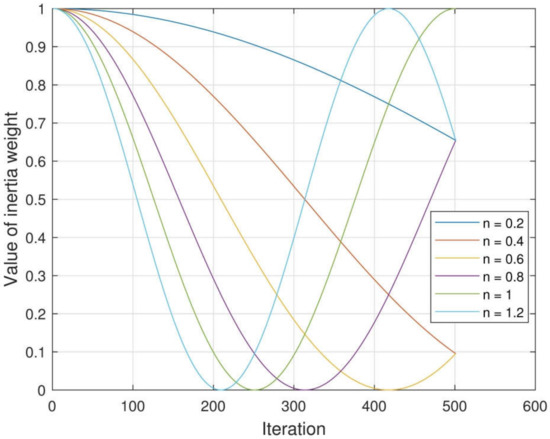 Obviously, is a cosine function with the period . The parameter controls the change period of . Figure 3 illustrates the variation curves of under different during the whole optimization procedure. The value of is determined by a large number of numerical experiments as for unimodal function and for multimodal function, which implies that . According to Figure 3, the value of decreases first, and then increases in the whole optimization process, which is not in line with our intuitive cognition and has guiding significance of the construction of inertia weight.