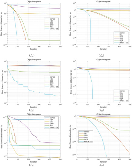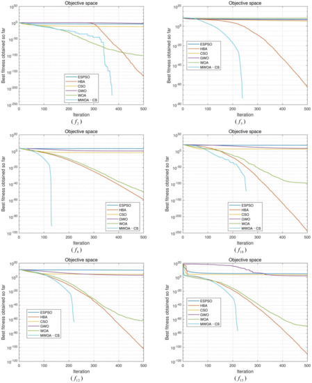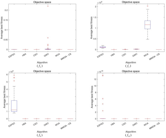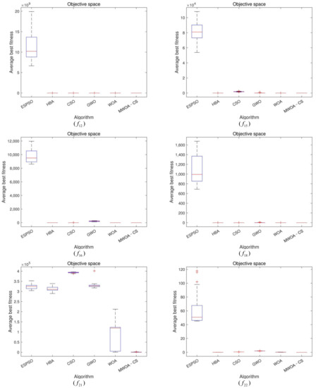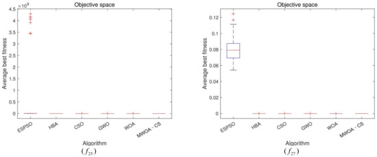 (2) For the multimodal functions, MWOA-CS displays a good exploration ability except for and . When dealing with and , MWOA-CS is the most efficient method, compared with the others. For and , both MWOA-CS and HBA can achieve the global solution, and WOA is the third most effective algorithm. For and , MWOA-CS, WOA and HBA show the best optimization performance, followed by CSO. For , MWOA-CS shows the best performance with respect to accuracy, but the standard deviation is inferior to ESPSO, HBA and WOA, and stronger than CSO and GWO. For and , CSO exhibits the best competitive method, and MWOA-CS the second best, followed by WOA.