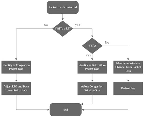 The value of RTT is observed for the identification of packet losses. It can identify the packet losses due to both link failure and network congestion. If the RTT value is less or equal to the RTO value, it means that the packet loss is due to link failure otherwise the packet losses are due to network congestion. Moreover, to distinguish between link failure and wireless-related packet losses, the parameters related to the triggers of the retransmission are monitored. The RTO parameter is useful to identify whether the data transmission link between the sender and receiver nodes is down or not. However, the wireless-related packet loss is generally detected by three duplicated ACKs. Figure 2 illustrates the key concept of the loss differentiation algorithm of TCP-LoRaD.