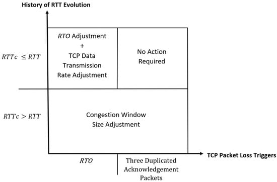 The conditions of packet buffering and queuing in the end nodes and the path capacity are the main parameters that need to be considered when updating the size of the congestion window. The rate of data transmission is estimated according to the characteristic of the newly discovered path, and it is calculated differently for each scenario. TCP can use the actual rate of data transmission and its congestion control mechanism to handle packet queuing and buffering before any packet losses are notified in the network. The RTT value is used here again because it can reflect the capabilities of the transmission links. The calculation of the new TCP transmission rate is given by