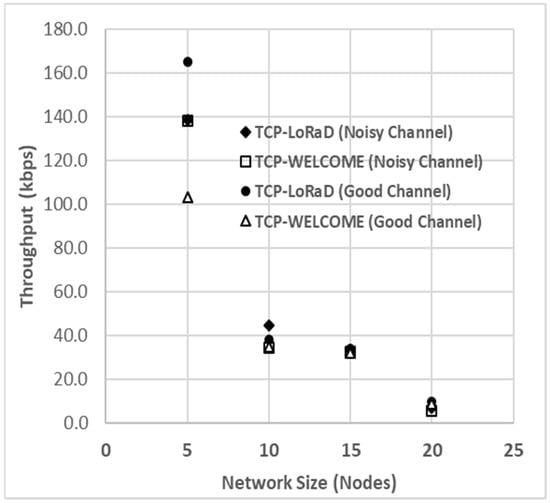 Throughput versus increasing the number of nodes in a noisy channel. Comparison of TCP-LoRaD and TCP-WELCOME. Results for good channel conditions are also presented for comparison purposes.