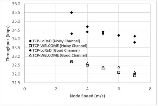 TCP Throughput versus node speed in a noisy channel. Comparison of TCP-LoRaD and TCP-WELCOME.