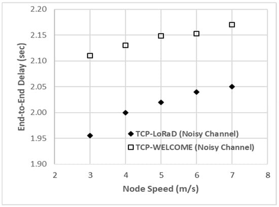 End-to-end delay versus node speed: Figure 10 compares the end-to-end delays of both variants in the noisy channel in the small-to-medium-sized network. We observe that TCP-LoRaD offers up to 6% lower end-to-end delays than TCP-WELCOME. The link failure and network congestion would occur more often because of the higher node speed and noisy channel. Consequently, the queuing delay is increased, and takes longer for the packet waiting to be sent out at the buffer; hence the end-to-end delay is affected and increases as the node speed increases.