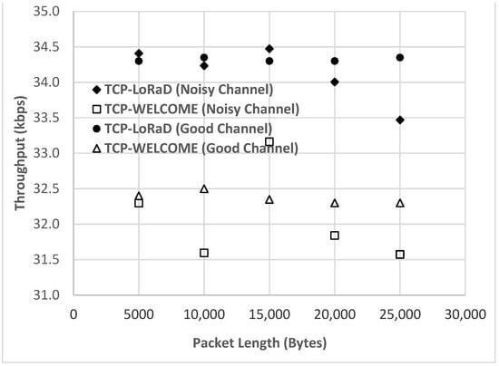 We observe that the increasing packet lengths introduce more network traffic loads over the connection causing packet losses due to network congestion; hence the throughput decreases with the increase of packet lengths which is expected. However, we found that TCP-LoRaD achieves up to 7% higher throughputs than TCP-WELCOME in noisy channels.