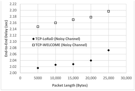 End-to-end delay versus packet length: Figure 14 compares the end-to-end delays of both variants in a noisy channel with increasing packet lengths. We observe that the network congestion would occur more often due to heavy traffic loads generated by the increasing packet lengths. The network congestion introduces more queuing delay at the buffers during the data transmission, and therefore the end-to-end delay increases as the packet size increases. Overall, TCP-LoRaD achieves up to 6% lower end-to-end delays than TCP-WELCOME in a noisy channel.