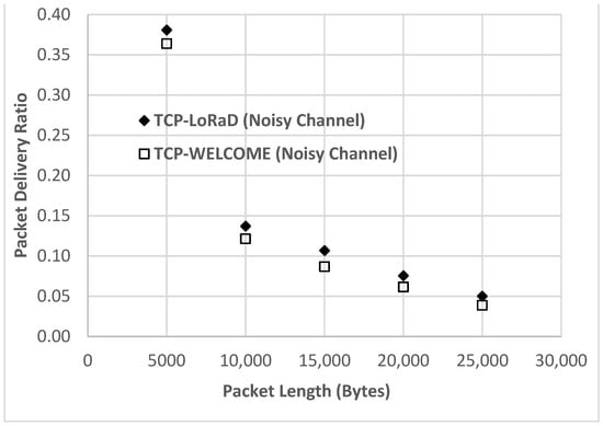 Packet delivery ratio versus Packet Length in a noisy channel. Comparison of TCP-LoRaD and TCP-WELCOME.