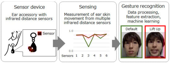 The flow up to gesture recognition of the proposed method is shown in Figure 1. The ear accessories contain several infrared distance sensors. When users move their face (e.g., the cheeks or chin), the skin inside and around their ear canal physically moves, as does the distance between the ears and face. The temporomandibular joint moves when the mandibular condyle moves, as does the skin inside the ear hole (e.g., the ear canal) [8]. This skin movement is acquired using the proposed method based on the change in distance from the infrared distance sensor to the skin. Then, machine learning is applied to multiple sensor values to recognize facial gestures.