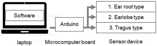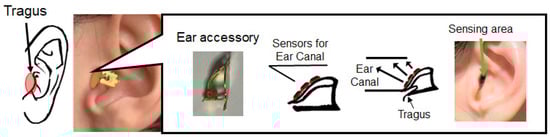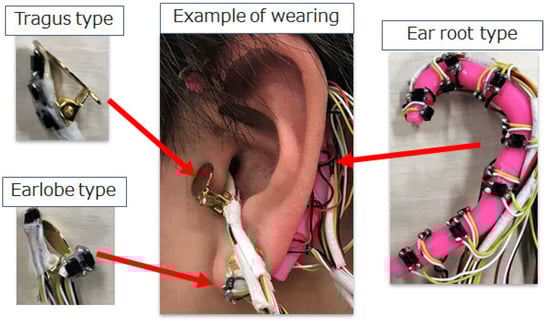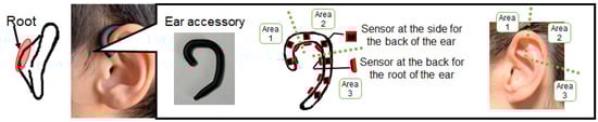 Wearing sensor devices are depicted in Figure 6. The base of the ear-root-mounted device was made of silicone ear hooks. As the base of the tragus-mounted device and the earlobe-mounted device, ear accessories that sandwich the parts of the ear were used—the TPR-105F infrared distance sensor from SANYO Electric Co. was used. Two devices were created for each of the three devices to be worn on the left and right ears. The dimensions of the infrared distance sensor were 2 mm (width), 2 mm (length) and 1 mm (thickness).