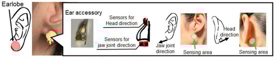 Many studies have proposed using ear accessories, such as earphones, to provide a hands-free input method. As the shape and wearing of ear accessories are socially acceptable, devices that use them as controllers for hands-free input are likely to be accepted by society. Gesture input methods based on intentional face movements using sensors (e.g., barometers, microphones, infrared distance sensors and electrodes) mounted on canal-type earphones have been proposed in previous studies [4,5,6,7,8,9,10]. Such gesture input methods based on facial movements using ear accessories is effective as a simple input method in scenarios where the number of input contents is not large and can be used even in situations where it is difficult to use the hands-free input method using voice recognition (e.g., scenes with a lot of environmental voices and a high psychological load of speaking).