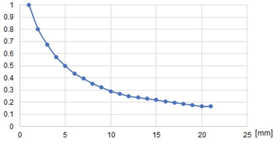 The sensor measures a straight line distance from the front to the object. Figure 7 shows the characteristics of skin surface reflection captured by a sensor. We measured the sensor output value from a sensor that changes in accordance with the distance between the sensor and the skin surface. Five samples were collected at each position. The horizontal axis shows the distance between the sensor and the skin, and the vertical axis shows the normalized output value.
