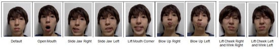The nine types of gestures shown in Figure 8 were used. These were determined based on previous studies [4,6,8]. The outline of gestures was ones that moving the facial parts of the chin, mouth, cheeks and eyes. The details are as follows. The Default is expressionless. Open Mouth is a gesture that opens the mouth wide. Slide Jaw Right is a gesture that moves the jaw to the right. Slide Jaw Left is a gesture that moves the jaw to the left. Lift Mouth Corner is a gesture that raises both cheeks. Blow Up Right is a gesture that swells the right cheek. Blow Up Left is a gesture that swells the left cheek. Lift Cheek Right and Wink Right is a gesture that raises the right cheek while closing the right eye. Lift Cheek Left and Wink Left is a gesture that raises the left cheek while closing the left eye.
