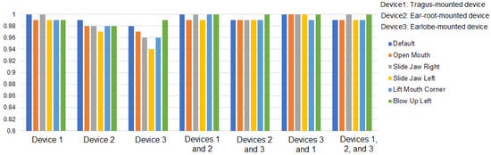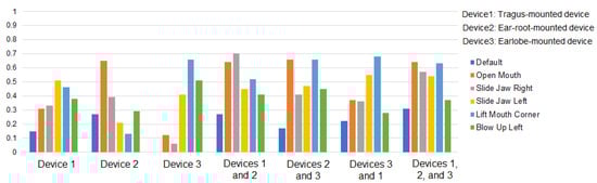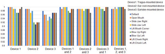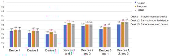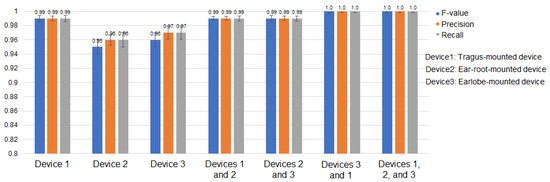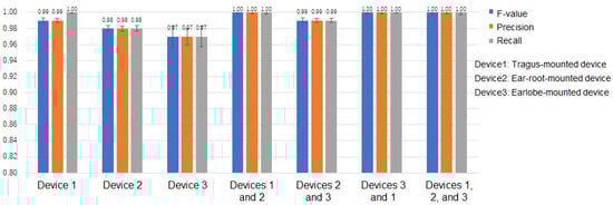 Tragus-mounted device (Device 1) had an F-value of 0.99 (min = 0.96 and max = 1.00) and the highest recognition accuracy among a single device. The F-values for Ear-root-mounted device (Device 2) and Earlobe-mounted device (Device 3) were 0.95 (min = 0.88 and max = 0.99) and 0.96 (min = 0.90 and max = 1.00). These results show that individual devices are capable of performing adequate recognition. Furthermore, these results show that the recognition accuracy can be improved by combining multiple devices. For example, the F-value of the device pattern consisting of Ear-root-mounted device and Earlobe-mounted device (Device 2 and Device 3) was 0.99 (min = 0.96 and max = 1.00), which was higher recognition accuracy than the pattern in which these two devices are used alone. Some devices have individual differences in recognition accuracy. Tragus-mounted device (Device 1) had high accuracy for all subjects. However, Ear-root-mounted device (Device 2) and Earlobe-mounted device (Device 3) had lower recognition accuracy for some subjects. For example, Subject 5 had an F-value of Ear-root-mounted device (Device 2) of 0.93 and Earlobe-mounted device (Device 3) of 0.90. This can be seen from the results of the min of F-value of Ear-root-mounted device (Device 2) and Earlobe-mounted device (Device 3).