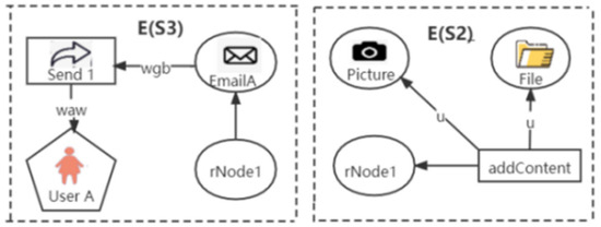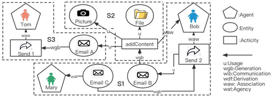 Figure 2 shows a partial provenance graph of an entity EmailC. In Figure 2, the edge <EmailC, Send2> means that the entity EmailC was generated by the activity Send2. The edge <addContent, file> means that the activity addContent manipulated the file. Assume that the entity EmailA is sensitive to the provenance requester A, that the entity file is sensitive to the provenance requester B, and that the maximum length of paths in a subgraph is set as 2. Executing the proposed partitioning algorithm starting from the entity EmailC can produce three provenance subgraphs S1, S2, and S3, as shown in Figure 2. The data owner can share only S1 and S2 to the data requester A to avoid the leakage of the sensitive EmailA in S1.