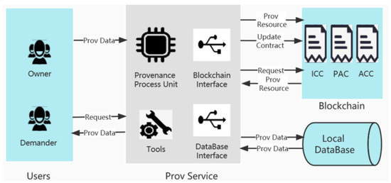 A prov service usually runs in a trusted zone for a specific peer and consists of a provenance process unit, a blockchain interface, a database interface, and a set of tools. The provenance process unit is used to partition a local provenance graph into multiple small subgraphs and compose multiple subgraphs obtained from the blockchain into a cross-domain provenance view. The blockchain interface and the local database interface is used to interact with the underlying blockchain and the local database, respectively. A set of tools is used to manage local asymmetric encryption key pairs, and to encrypt and decrypt provenance subgraphs.