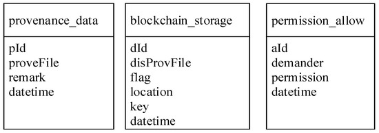 In the process of data provenance sharing, the fields in these tables can change dynamically. A provenance owner first uploads a provenance graph and the prov service then stores it into the provenance_data table. The prov service then partitions the provenance graph into several subgraphs, encrypts them symmetrically, and stores them in the blockchain_storage table. Fields location and flag are left empty temporarily.