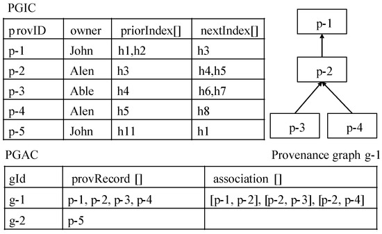 Figure 6 shows the state of the smart contracts PGIC and PGAC after a series of provenance uploading requests were processed. The PGIC stored the index information of provenance graphs that are numbered p-1 and are shared by the provenance owners John, Alen, and Able, respectively. Note that the name of a provenance owner can be replaced with his/her public key or blockchain address for preserving privacy in practice. Whenever the index information of a provenance graph is stored in the PGIC, the PGAC is invoked to link the newly added provenance graph to existing provenance graphs by traversing and matching their priorIndex and nextIndex, or to create a new cross-domain provenance graph when necessary. For example, g-1 is created when the graph p-1 is uploaded. Then, p-2 is added into g1 because of the prior index of p-2 is h3 that is identical to the next index of p-1. Furthermore, g-2 is created when the graph p-5 that cannot be linked to any existing graphs is uploaded. The smart contract PUSC is shown in Algorithm 2.