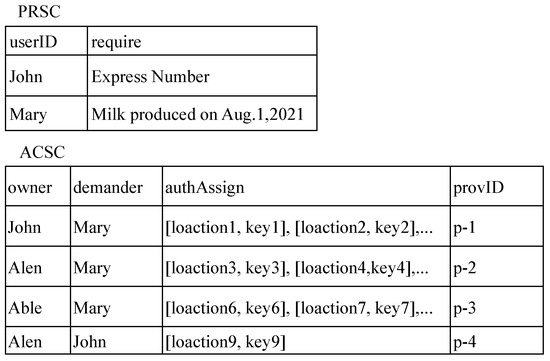 Figure 7 shows the state of the smart contract ACC after a series of provenance requests were processed and authorized. A permission in ACC includes four fields: the provenance owner, the provenance requester, the pairs of the location and key of shared targets, and the number of the provenance graph. When a provenance owner John receives the request issued by Mary, he first selects some provenance subgraphs required by Mary in the local database and then defines a permission with pairs of locations and keys [location, key] in the authAssign field in the local database. He uses the public key registered by Mary in ISSC to encrypt the authAssign field and then submits the permission with the encrypted authAssign field into the smart contract ACSC so that this permission can only be decrypted by Mary.