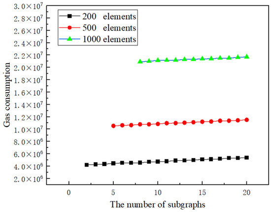 In practice, when the consortium blockchain starts, m is usually defined by each peer independently as , where is the average size of each element in a provenance graph and is the block size limit predefined in the genesis block. The cost of storage Costgas varies when the total number of nodes n and the number of subgraphs changes. In our experiments, we set the parameter c to 0.4 kb and b to 40 kb, and the number of elements in a provenance graph n to 200, 400, or 1000. Then, we explore how the storage cost Costgas changes when the number of subgraphs changes. As shown in Figure 10, if the number of nodes in a provenance graph to be uploaded is fixed, the gas consumption for storing it onto the blockchain increases along with an increase in the number of subgraphs in the provenance graph. Thus, less provenance elements embedded in a transaction can lead to a higher overall storage cost. At an extreme, our approach can degenerate to the one that embeds one provenance record in a single transaction. In fact, when the number of subgraphs is low, the main gas consumption is used for storing the provenance graph itself. However, when the number of subgraphs is high, the total gas consumption for transactions of uploading a lot of subgraphs becomes non-trivial. In addition, we can see from Figure 10 that when the number of elements increases, the minimal number of subgraphs increases.