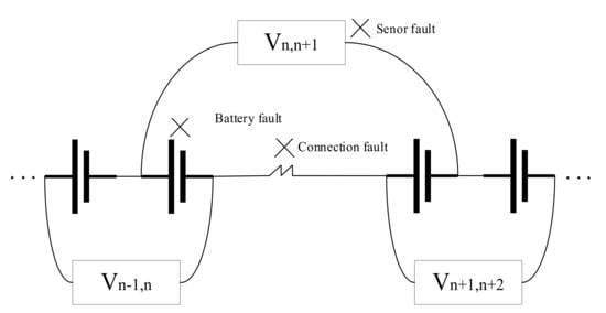As shown in Figure 1, cross-cell sensors, i.e., V1~Vn, measure the sum potentials of two neighbor batteries, whereby various fault signals can be covered effectively.