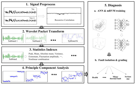 As shown in Figure 2, this paper presents a generic fault diagnostic scheme. The RPC time series of neighbor voltages are disassembled into multiple sub-bands by wavelet transform, and fourteen indexes are gathered from the bottomed sub-bands to reflect system state information. PCA is used to refine these indexes to principal components (PC) which are fed to ANN and mRVM as inputs for model training and resultant models can be applied for online fault diagnosis. As for fault degree, the severity of faults is classified into four levels: no fault (healthy), minor, moderate, and critical.