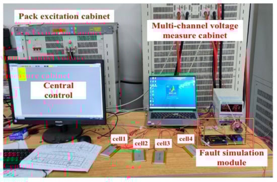 As Figure 3 depicts, in order to obtain real fault data, a platform is built up with two battery test cabinets, a battery pack with four Li-ion cells (NCM, 3.7 V, 4 Ah) in series, a fault-injection module and a host computer. The load current is the Federal Urban Driving Schedule (FUDS). Herein, one test cabinet (60 V/50 A, 0.1% FS) is responsible for pack charging and discharging, and the other test cabinet (5 V/200 A, 0.02% FS) has four channels which are used to measure the potentials of the four cells. Four kinds of faults including internal short-circuit (ISC), external short circuit (ESC), poor cell connection (PCC) and thermal damage (THD) are simulated with the configuration in Table 2. The fault-injection module controls a motor and several relays to simulate PCC fault and ESC fault: PCC fault is simulated by intermittently connecting the inter-cell resistor which is passively driven by the vibration from the motor; ESC is simulated by contacting cell electrodes with different ESC resistors by the relays. ISC is induced by electric abuse of overcharge and THD is simulated with a heat gun in which jet heat flows on the cell surface.