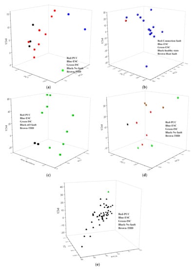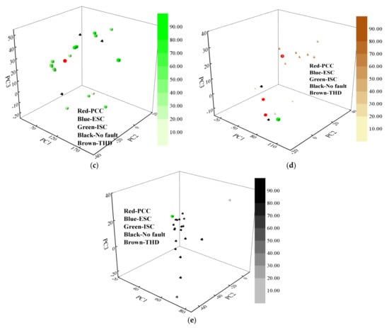 Another 100 FTC samples of data are used as test samples. Figure 4 shows the classification performance of the five fault states in different colors: (circular, connection fault), (sphere, ESC fault), (square, ISC fault), (starriness, thermal fault) and (triangle, no fault). The samples with distinct colors are the misjudged ones. As can be seen, only a few samples are misjudged. In Figure 4a, there are six “PCC” samples that are misjudged as other faults. In Figure 4b, only one “ESC” sample is misjudged as “PCC”. In Figure 4c, two “ISC” samples are misjudged as “No fault”. In Figure 4d, most “THD” samples are misjudged as other faults and the success rate is only 33.67%. In Figure 4e, only one sample is misjudged. In summary, thermal faults are the most difficult to identify, and the success rate of fault isolation for all cases is 82%.