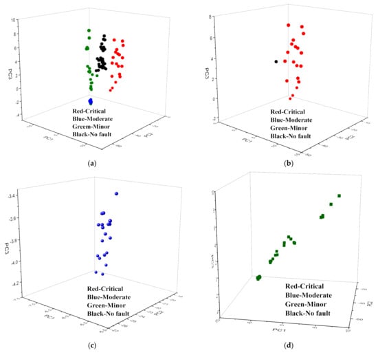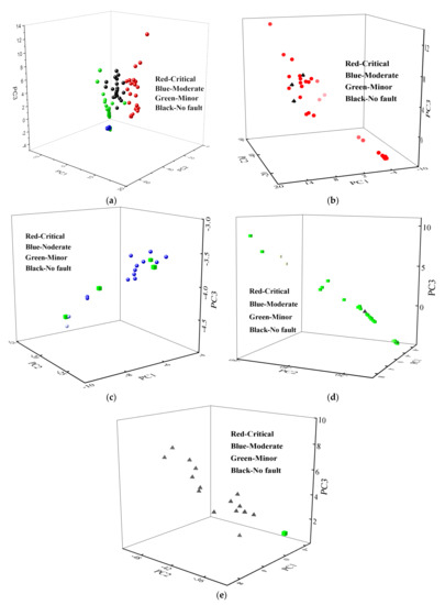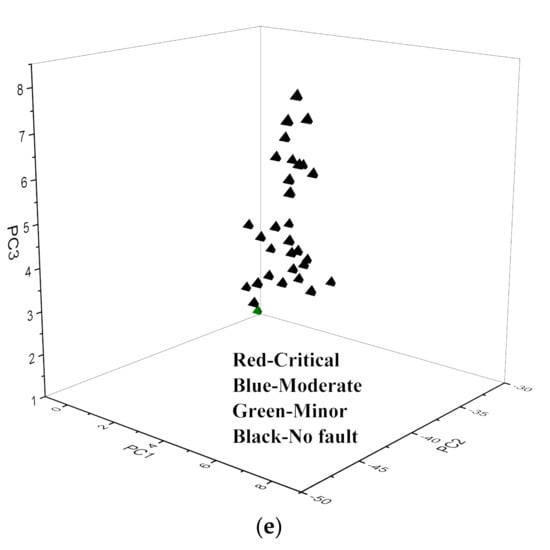 Similarly, 500 and 100 FDE samples are used to train and test the mRVM model, respectively. Figure 7a–e show the classification results, in which the shapes with distinct colors are misjudged ones. Most types of misjudged faults are prone to be underestimated regarding severity. For example, three of the “critical fault” samples in Figure 7b are judged to be “No fault”, and four of the “moderate fault” samples in Figure 7c are judged to be “minor fault”. In Figure 7d, a few “minor fault” samples are judged to be “No fault”. Nevertheless, some faults are overestimated, such as in Figure 7e, one “health” sample is judged as “minor fault”. In conclusion, the success rate of identifying the severity of all cases is 90%.