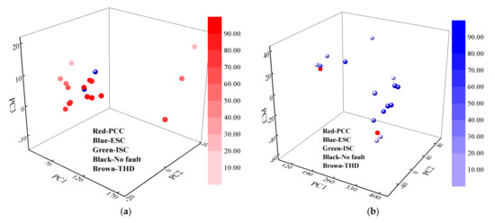 In order to deal with the nonlinearity of feature space, the Gaussian function is used as the kernel function of mRVM in this work. The involved parameters are determined based on the gradient descending rule. Each fault type is given a posteriori probability as confidence, indicating the degree to which it belongs. The maximum confidence is determined as the classification result. Figure 6a–e show the fault classification results on different FTC data samples, and different shape markers represent different faults. There are two small sphere colors in Figure 6a, which mean erroneous judgments. Figure 6b shows some “ESC” samples are misjudged as “PCC”, while in Figure 6c, a small number of “ISC” samples are judged as “No fault” or “PCC”. In Figure 6d, several “THD” samples are determined as other fault types, with a successful isolation rate of 35%. In Figure 6e, only one sample is misjudged. To sum up, thermal faults are the most difficult to identify, and the overall success rate of fault isolation is 81%.