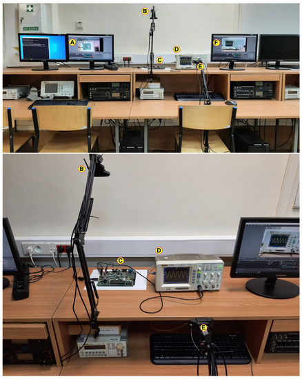 Figure 2 shows one FPGA-based remote electronic system design stand. Each of these stands has two video streaming channels—the first to view the FPGA test board and the second to view the video stream from the camera pointed at the oscilloscope. Due to certain priorities in the development of the stand and financial constraints, the components used—the mechanical arm and webcams—are not of the highest quality; however, the quality is sufficient for the purpose of teaching.