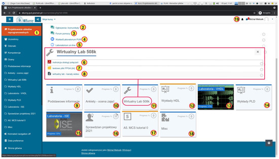 Screen of the home page of the Fundamentals of Digital Design and Synthesis course. The interface of the ’ekursy’ platform is in the Polish language. 1—Course name, 2—announcement section, 3—help forum, 4 and 5—links to the audio and video communicators, 6—remote connection procedure instruction, 7—FPGA programming test files, 8—section with embedded twich.tv channels, 9—basic information about the course, 10—student course evaluation, 11—section related to remote access, 12—section with lectures on VHDL (VHSIC Hardware Description Language), 13—section with VHDL tasks, 14—section with lectures on programmable logic devices, 15—section with ISE tasks, 16—final project exam, 17 and 18—additional materials and tutorials, and 19—user name.