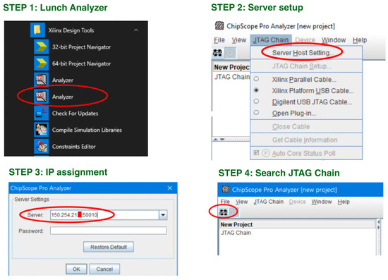Figure 4 shows the steps required to remotely program FPGA. All the programs needed for remote work in the lab were configured on a virtual machine available on the course website as mentioned earlier. The student begins by establishing a VPN connection to the PUT network. Users with student account restrictions should have permissions set to establish connections to the appropriate TCP ports on the lab subnet. In case of doubts, students are advised to contact the instructors in charge. The next step is to run the Analyzer program. The Analyzer is executed from the Xilinx 64-bit tools group (see Figure 5).