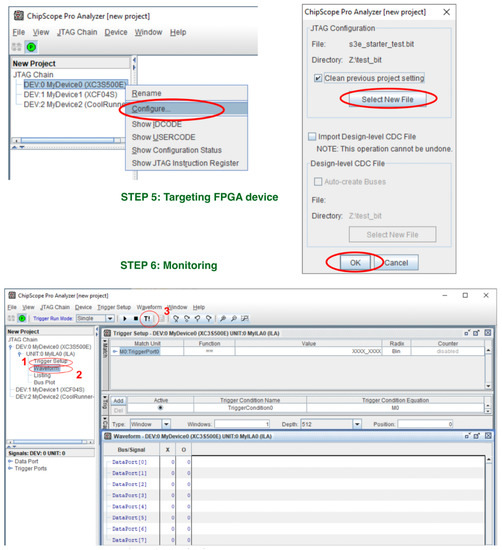 Remote programming and simulation. All steps are performed remotely from the students’ home computers. The detection of devices on the test board is confirmed by creating a tree with DEV0-DEV2 positions in the JTAG Chain section. The FPGA to be programmed is the XC3S500E. To simulate a test project, the following steps are needed: 1—open the trigger window, 2—open the time waveform window and 3—force the measurement trigger signal.