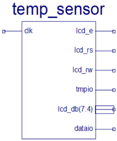 The DHT11 sensor is permanently connected to the Spartan 3E Starter Kit. The student’s task (described in the lab manual and the Spartan 3E Starter Kit) is to identify the ports to which the sensor is physically connected. This is necessary to specify the ports in the ucf file. Figure 7 shows the symbols of the module designed for the DHT11 sensor. This symbol is generated automatically based on VHDL source codes using the XILINX ISE WebPack design environment. The clock is at 50 MHz with a —input/output port for communication with the temperature and humidity sensor DHT11. The output signals are —start display, —restart display, —read/write signal from/to display, —signal to send data and commands to display and read data and —signal to preview the sensor signal, which is used in the chipscope to show what the present reading from the sensor.