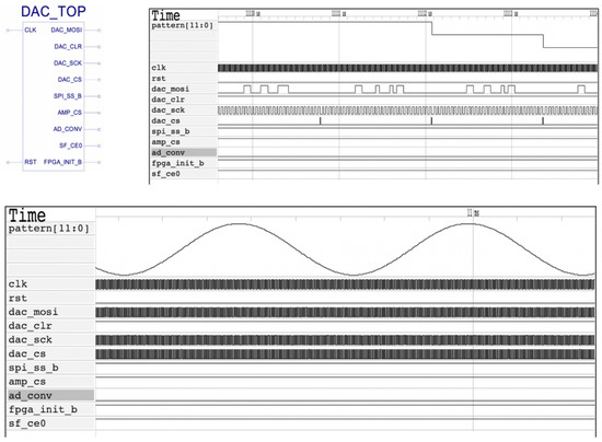 The DAC_TOP (designed sinusoidal waveform generator) along with its simulation results in different time intervals. The control signals are: —sends commands and data to the DAC, —resets the DAC, —SPI clock to the DAC, —selects the SPI device to communicate with in this case, it is the DAC.