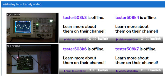 After remotely programming the test board with the FPGA, the student obtains a real-time preview (with a delay of up to several seconds) of the readout of the video stream from the camera pointed at the test board with the FPGA chip and the video stream of the camera pointed at the oscilloscope’s faceplate. Figure 10 shows a section with a preview of the video feeds available in one of the ’ekursy’ tabs. The twitch.tv platform was used for streaming, and the streaming channels were integrated into the ’ekursy’ platform under the link available in the ’virtual lab’ module. For the purpose of this article, only two channels are shown. The rest of the channels are not launched.