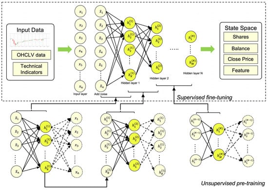 Raw financial data can only indicate patterns or characteristics of market dynamics to a limited extent, so it is not ideal for direct input to RL agents. However, putting all price data and technical indicators into the state space will lead to complex design and delay. Delay is a key factor in algorithmic trading. Most studies simplify the state space by using only OHCLV data []. A better solution is to reduce the dimension through the feature extraction method. Therefore, we propose using an autoencoder network to extract features from raw financial data and encoder features with robustness information. Figure 1 depicts the SSDAE autoencoder network’s structure. indicates the input data of the ith node, and indicates the input data of the kth node of the Nth hidden layer. The arrow in the network represents the connection weight between two adjacent layer nodes.