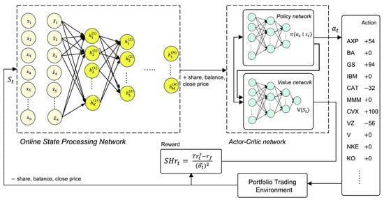 There are currently only a handful of quantitative studies that employ the actor–critic algorithm. The authors of [] conducted a comparison of three actor–critical algorithms: proximal policy optimization (PPO), advantage actor critical (A2C), and deep deterministic policy gradient (DDPG). Experimental results indicated that A2C outperforms other algorithms. As a result, this paper employed A2C and implemented it using stable-baselines3 []. The framework of our proposed model is described in Figure 2.