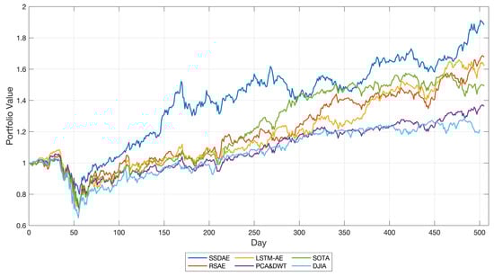 It was also difficult to compare the results of our proposed method with other studies due to the difference in transaction variety, mode, environment, and RL algorithm. All comparative methods are trained and traded under the same trading environment, trading rules, and parameters. For comparison with our proposed model, in addition to the DJIA index, we selected an advanced portfolio management strategy from the current literature to compare the performance that was an open-source method that does not use feature extraction and improves performance by integrating multiple agents []. We also implemented several variants or simplified versions of SSDAE to investigate the roles of several key components: we chose RSAE [], which lacked a sparse and denoise network compared with our proposed method; LSTM-AE [], a method of extracting time series information for financial series; and a machine learning method using PCA and wavelet denoising technology [].