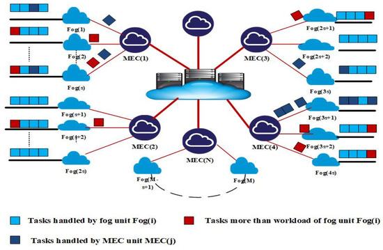 Fog and MEC units can both host and support services in a matured edge computing paradigm depicted in Figure 3. Our previously developed offloading scheme presented in [41,42] is considered for the developed two-tire edge computing-based IoT system. Fog nodes or MEC servers can be used to do tasks that are too complex or of high energy cost. Figure 4 depict the levels of offloading of the created fog-MEC scheme, and Algorithm 1 is the considered offloading method for the developed model.