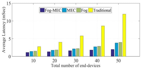 Simulated IoT networks include increasing numbers of deployed devices as they progress through the scenarios. This is a demonstration of the benefits of distributed edge computing. Introducing two tiers of edge computing units reduces the average time needed to perform computing operations. Compared to standard IoT networks with no edge computing units, the fog-MEC paradigm provides a performance boost of 67% in latency efficiency. The latency efficiency of IoT networks with only one level, i.e., fog nodes, improves by 46% when two layers of edge computing are included. Thus, the introduction of another edge computing level reduces the communication latency by processing and handling IoT tasks near IoT devices with small communication distances.