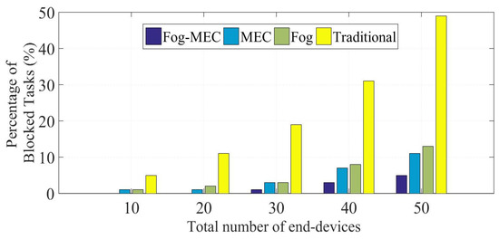 Percentage of blocked tasks for the proposed fog-MEC model compared to other existing systems.