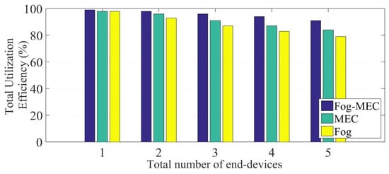 Total utilization efficiency of the proposed fog-MEC model compared to other existing systems.