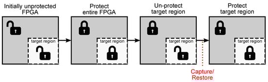 Later works, which tackle newer Xilinx devices, provide support for the case of two-dimensional partial reconfiguration. The approach presented in [14] develops the capacity of capturing, storing and copying the content of flip-flops within a Virtex-V FPGA device on a particular reconfigurable region by utilizing the bitstream in combination with the STARTUP_VIRTEX5 primitive, the RECAPTURE commands and the ICAP interface. The ICAP interface is a point-to-point connection between the ICAP (Internal Configuration Access Port) primitive and the SEM (Soft Error Mitigation) Controller. In a further approach [15], this approach was extended to enable copying the content of flip-flops between heterogeneous reconfigurable regions by processing the captured bitstreams. To determine which reconfigurable region is about to be targeted, both works follow the strategy depicted in Figure 1 to protect/unprotect against overwriting. Since the entire FPGA design is unprotected (open padlocks) by default, in the first step, the entire FPGA design has to be protected. When the context needs to be saved, the target region has to be protected (closed padlock) before capturing the data. This protection is carried out by including specific commands in the partial bitstream. After capturing the data, the target region can optionally be protected. In any case, before restoring the context, the target region has to be unprotected. After finishing context saving/restoring processes, the target region can be protected in order to avoid undesired changes in future startup sequences. In [16], the same authors presented an implementation of preemptive hardware multitasking for partially reconfigurable FPGAs that enables configuration prefetching and reuse. This approach, based on their previous works, reduces configuration overheads, improving the system performance.