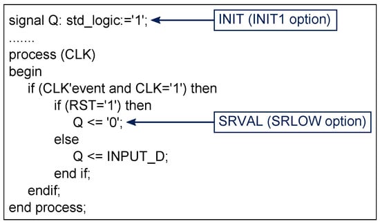Each flip-flop of 7 series devices provides SRHIGH/SRLOW (SRVAL) and INIT0/INIT1 (INIT) options [22]. Determined by the HDL (Hardware Description Language) design, each option and its value is configured and stored in the bitstream. The example from Figure 2 shows a VHDL (VHSIC Hardware Description Language) code for a flip-flop where both INIT and SRVAL values can be determined. While SRVAL values are controlled by the local SR control signal, INIT values are mainly utilized during the initialization after reconfiguration. However, INIT values can be updated by performing a context capture.