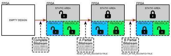 To circumvent this problem, a novel design flow that enables the unprotection of as many reconfigurable regions as desired, keeping the rest of the design protected, is proposed. It also avoids the need to save data from other non-protected regions. Inspired by an idea suggested in [16], the developed method enables the reading and writing of registers’ data of a particular region without affecting the rest of the device thanks to the RESET_AFTER_RECONFIG=TRUE [24] property. This can be used with 7 series devices to implement partially reconfigurable modules in order to avoid manual unprotection/protection actions. When implementing partially reconfigurable designs with this property in 7 series (for UltraScale devices is always enabled), the partial bitstream created by Vivado contains the commands to protect the rest of the device (including the static and the rest of the partial regions), keeping the actual partial region unprotected. Hence, this property enables protecting a particular partial region in a simpler manner. Nevertheless, as Figure 4 shows, this method can only unprotect (open padlock) a single partial region at once. As it can be observed, every downloaded partial bitstream unprotects the reconfigurable target module and protects (closed padlock) the rest of the device, even if the partial reconfigurable module has been previously unprotected. Thus, there is no way to unprotect more than one partial region from the same device.