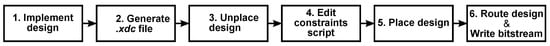 In order to overcome those drawbacks, this section presents the developed design flow to obtain homogeneous implementations of a particular HDL design in distinct reconfigurable regions without affecting the optimized design generated by the synthesis software, which, for the sake of simplicity, will be referred to it as Location Constraints Flow. This flow is based on utilizing the resource placement of one of the instances generated by Vivado to place the resources of the rest of the instances. Thanks to it, it is possible to obtain alike implementations in different regions for each design, placing each resource in the same positions of different columns (reconfigurable regions). A remarkable benefit of this approach is that it allows the copying process to be performed by copying entire bitstream portions and using a significantly simpler relocation process, and avoiding the need for data merging. Hence, it considerably simplifies the data copying program and minimizes performance penalties. This flow is specifically interesting in some designs that make use of hardware redundancy strategies, such as TMR (Triple Modular Redundancy) [25,26]. As described in Figure 6, it consists of several steps: