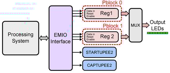 The validation of the proposed flows has been performed through several tests. Many of these tests have been performed during the developing process of the technique. A simplified block diagram of the validation setup used for the design’s development and validation is shown in Figure 7. Non-essential elements have been avoided to elude any possible impact on the bitstream’s content and structure. Initially, a very simple scheme has been designed by implementing two 8-bit registers in different reconfigurable areas. Reset ports of the two 8-bit register modules are managed by the processing system via the EMIO interface. The processing system also controls the CAP and GSR ports from CAPTUREE2 and STARTUPE2 primitives, respectively. With the aim of keeping simplicity and a faithful physical reading, the data input and output ports are connected directly to ZedBoard’s switches and LEDs (Light-Emitting Diodes), respectively. The switch connected to the first data bit also controls the multiplexer, providing the possibility of visualizing the connection between both registers in real-time. The bitstream is readback from the FPGA, combining the PCAP and the processing system, and stored in the DDR memory. The content of INIT values is obtained from the previously generated .ll file. The identification of the location of the flip-flop’s content has been carried out by utilizing a text editor.