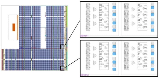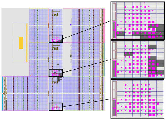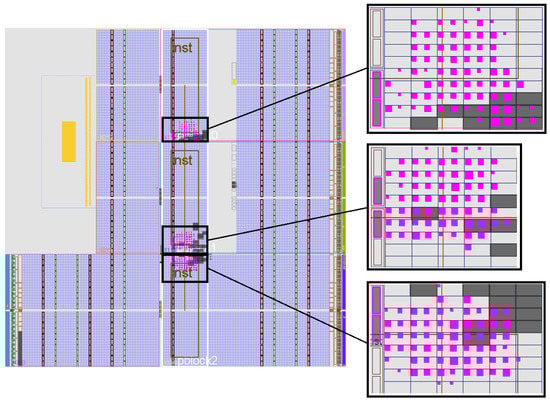Next, the Location Constraints Flow has been validated. In this case, a TMR design with three instances of a PICDiY soft-core processor [27] has been implemented in three reconfigurable regions (Pblock0, Pblock1 and Pblock2). In this first implementation, all resources of each instance have been freely placed by the tool. Thus, as can be observed in Figure 10 obtained from the device diagram of Vivado, the three resultant implementations have presented distinct placements. Afterward, the Location Constraints Flow was utilized to generate three alike implementations (selecting Pblock0 as a reference). As can be observed in Figure 11, the resource placement of the three entities within three Pblocks has homogeneous architecture. In a similar way, the generated partial bitstreams of the three Pblocks have been compared in order to check if the location of data bits within the bitstream is the same. Furthermore, as Table 2 and Table 3 demonstrate, the resource usage of both implementations is almost the same. Table 2 also confirms that the proposed design flow does not affect the implementation in terms of power consumption and maximum operation frequency. Further tests carried out on both implementations (with and without placement constraints) have demonstrated analogous results in terms of functionality.